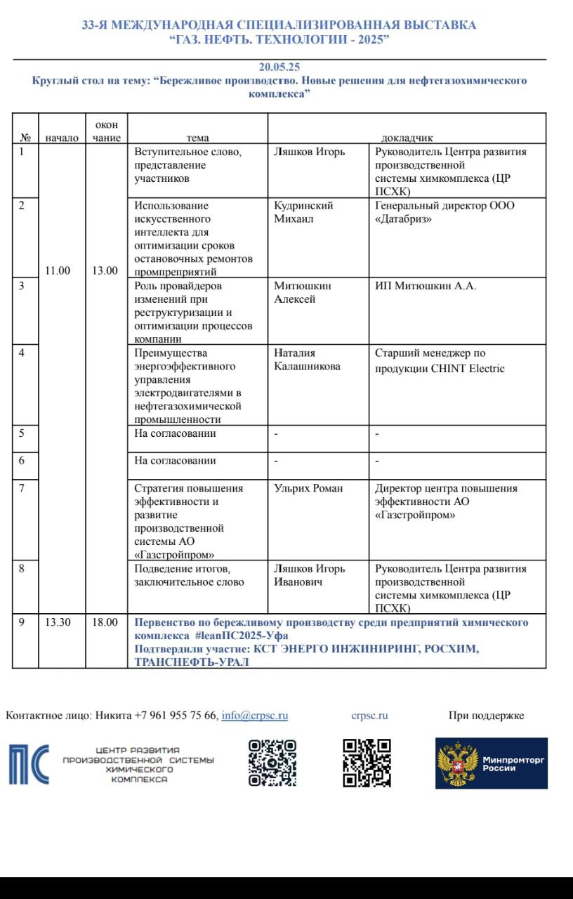 20 мая 2025 года Центр развития производственной системы химического комплекса (ЦР ПСХК) проведёт первое в этом году Первенство и Круглый стол #leanПС2025-Уфа по Бережливому производству в рамках международной выставки “ГАЗ. НЕФТЬ. ТЕХНОЛОГИИ-2025”.